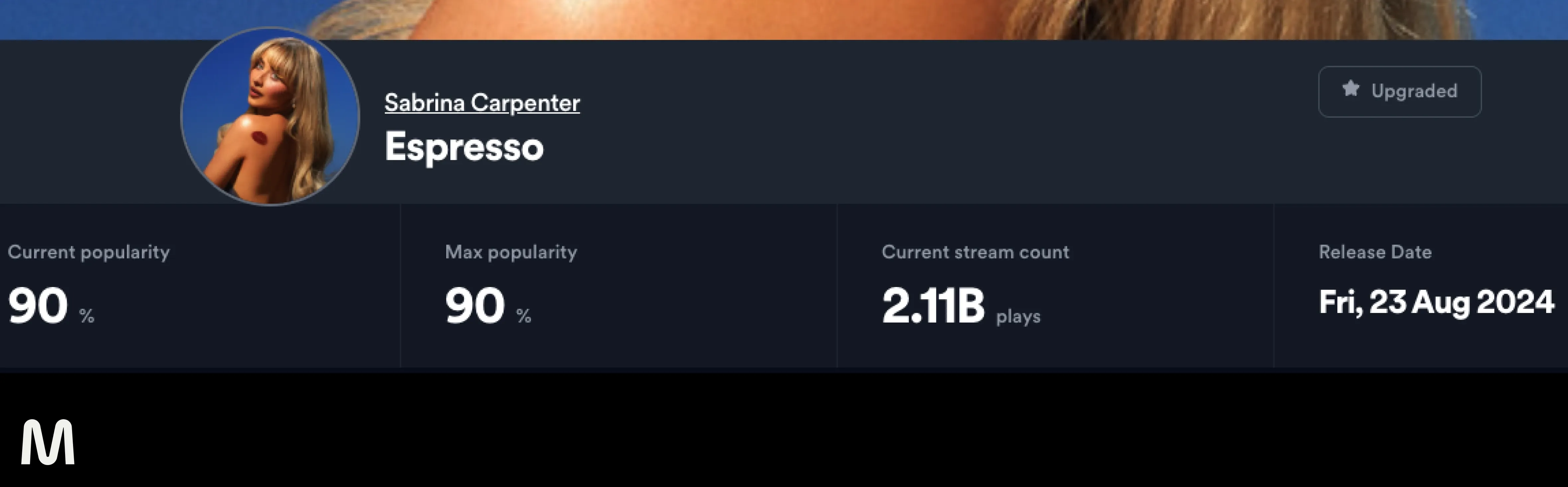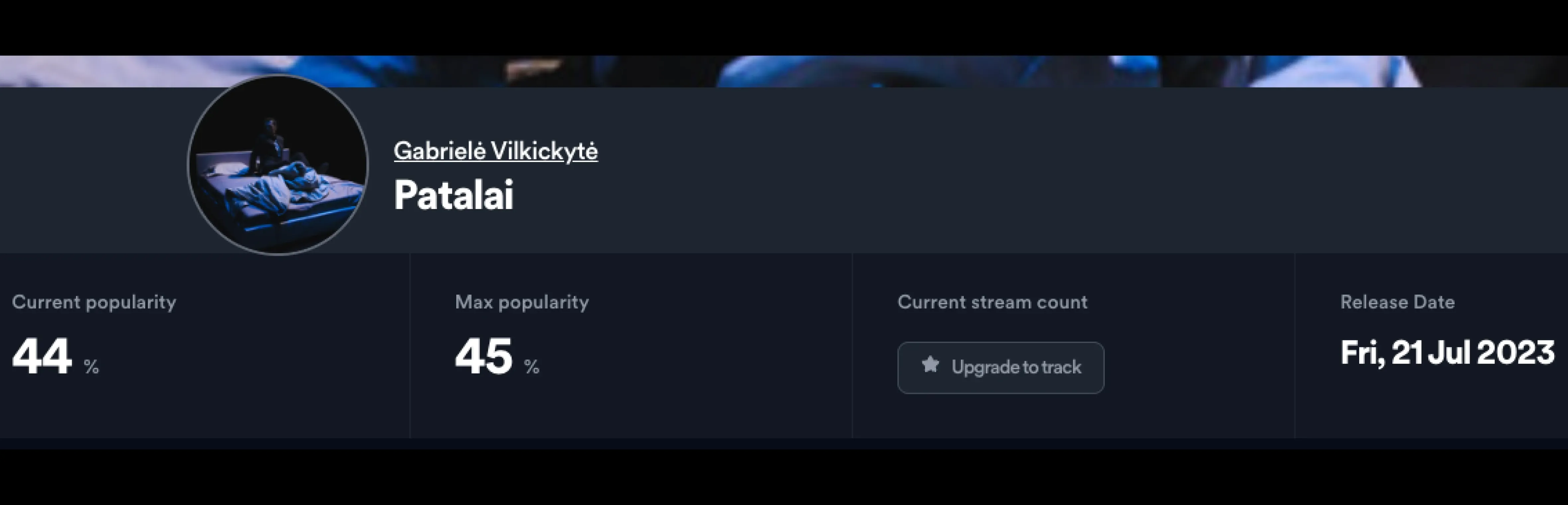 Artist Level: Here, you can see your monthly listener count, followers, and Spotify popularity score. The popularity score reflects the overall current interest in your entire catalog. Think of it as a health score for your presence on Spotify. A consistently high score signals strong overall engagement.