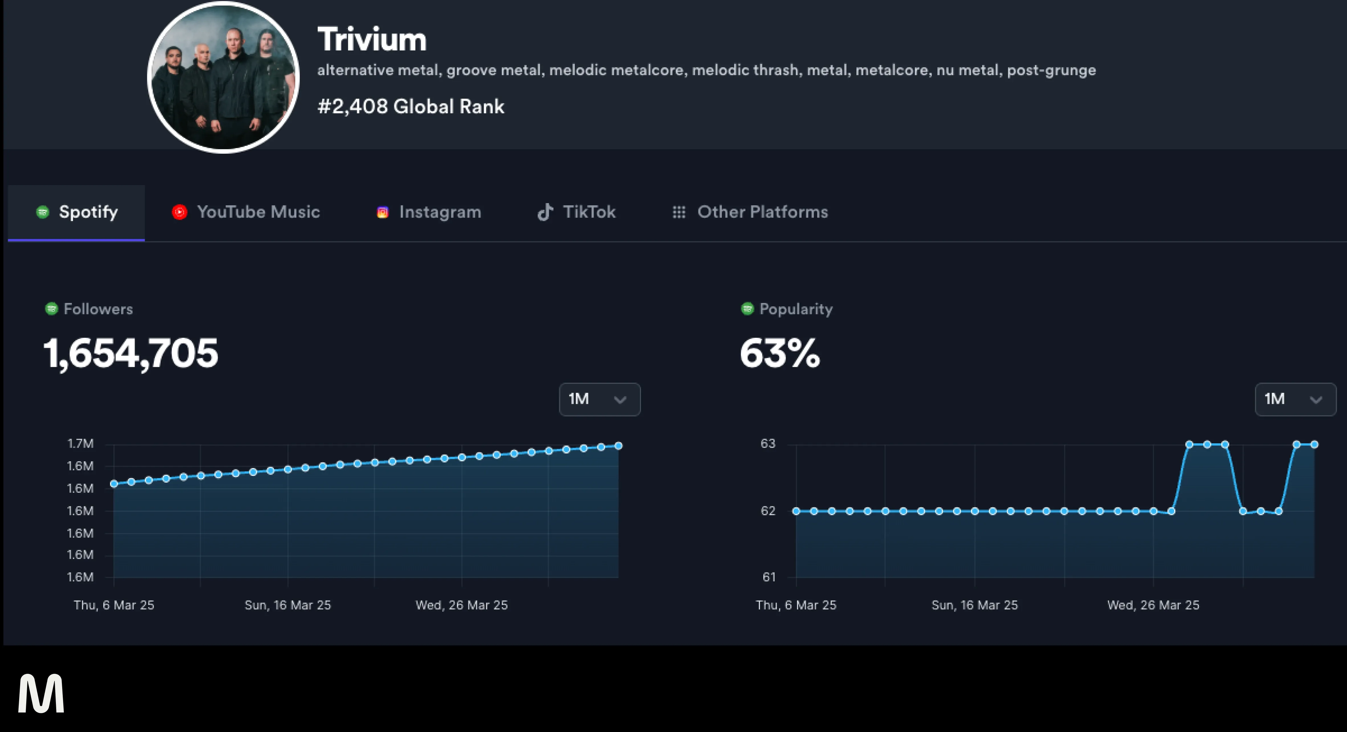 We also see that a famous metal band like Trivium has an artist popularity score of 63%.