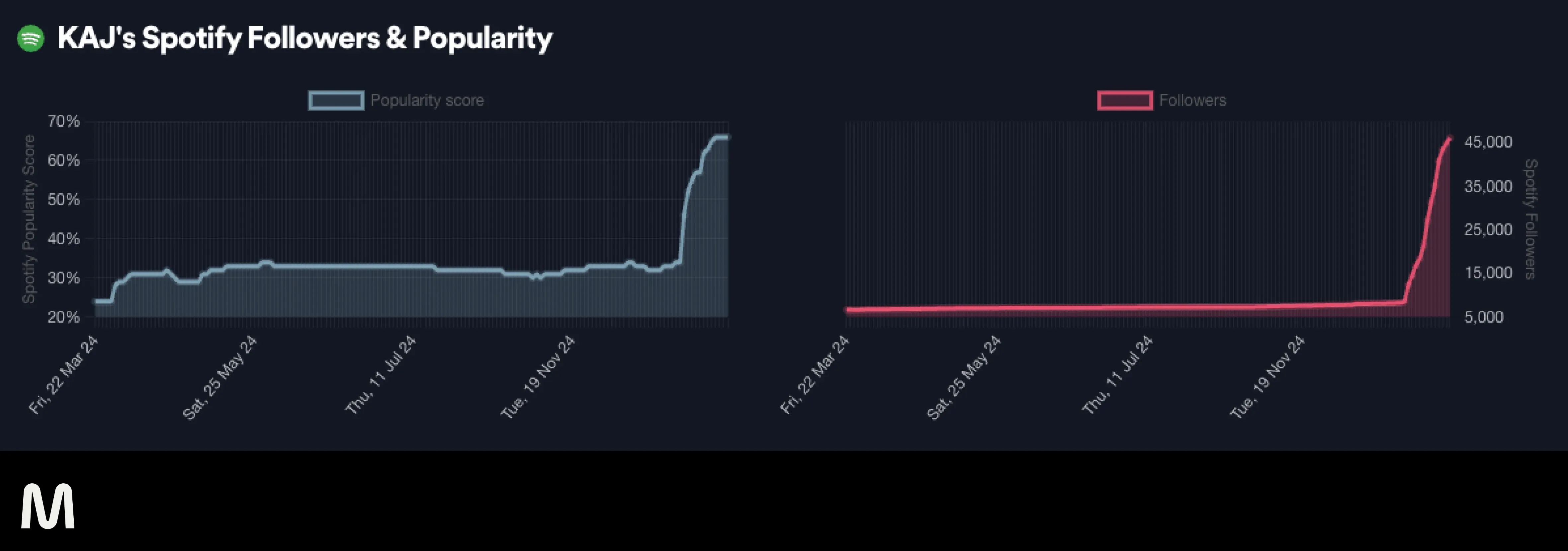 Following their selection to represent Sweden in Eurovision 2025, KAJ has experienced a rapid surge in Spotify popularity, as seen in the image below. This is a crucial window for targeted song marketing to leverage this momentum, likely to decrease significantly after the competition.